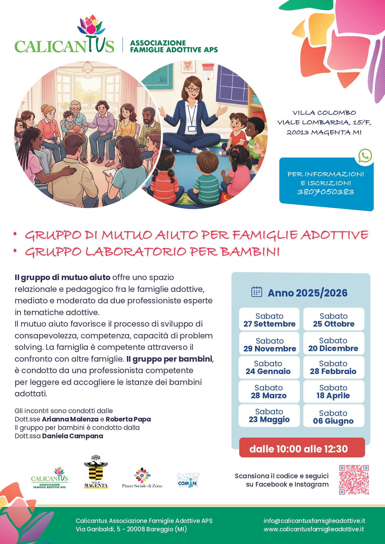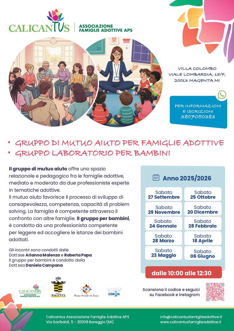 L’Associazione Calicantus Famiglie Adottive APS tiene mensilmente un gruppo di mutuo aiuto per famiglie adottive e un gruppo laboratorio per bambini presso la Villa Colombo, in viale Lombardia n. 15/F a Magenta.