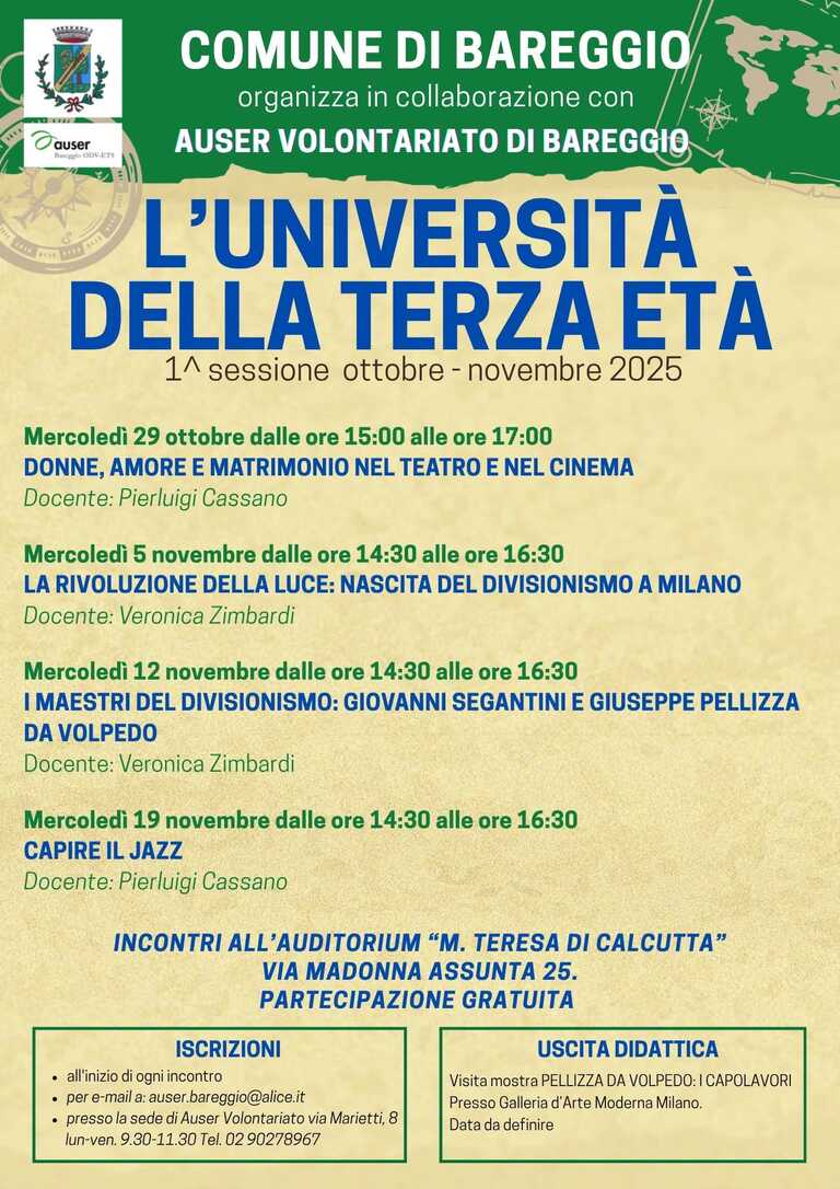 Il Comune di Bareggio organizza in collaborazione con Auser Volontariato di Bareggio l'Università della terza Età.